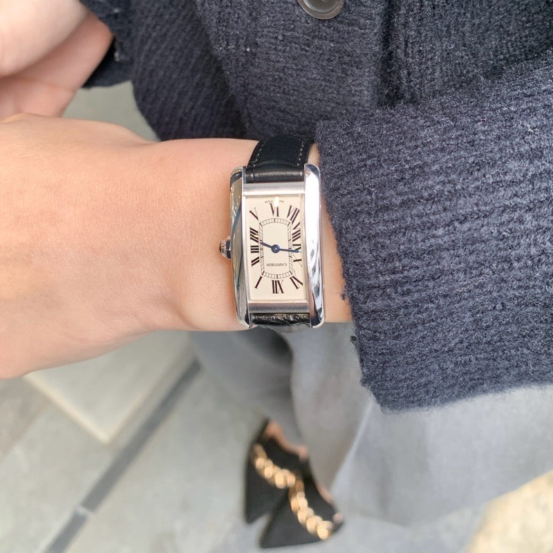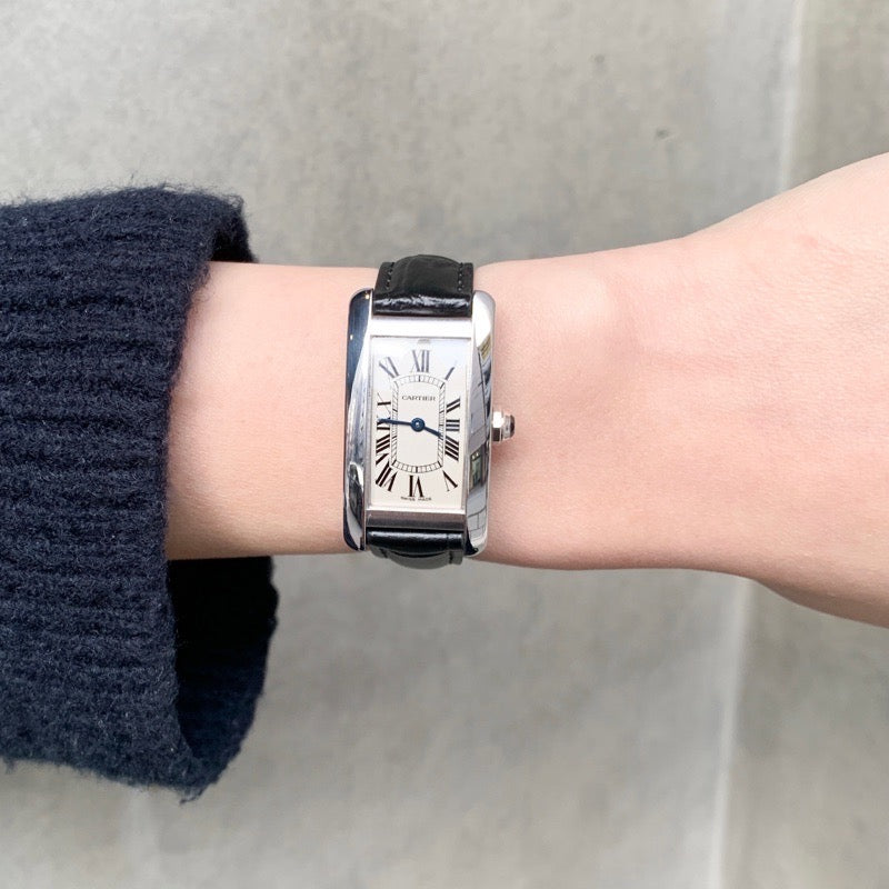 縦長のエレガントなケースラインが特徴の「タンク アメリカン SM」。 18金ホワイトゴールドのケースは、落ち着いた光沢で手元に洗練された印象を与えます。 細長いシルエットは手首をすっきりと見せてくれるため、女性に特に人気のあるデザイン。 レザーベルトとの組み合わせにより、ビジネスからフォーマルシーンまで幅広く活躍します。 18KWGならではの上質な質感と、カルティエらしい端正なデザインが魅力の一本。 永く愛用したい方におすすめのモデルです。 さらに当商品は当店職人、一級時計修理技能士による電池交換、点検、外装仕上済みで安心してご愛用いただける一本となります。