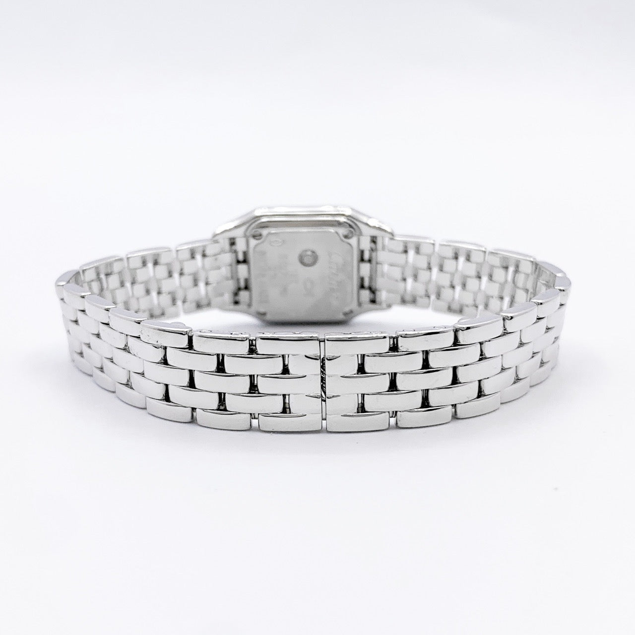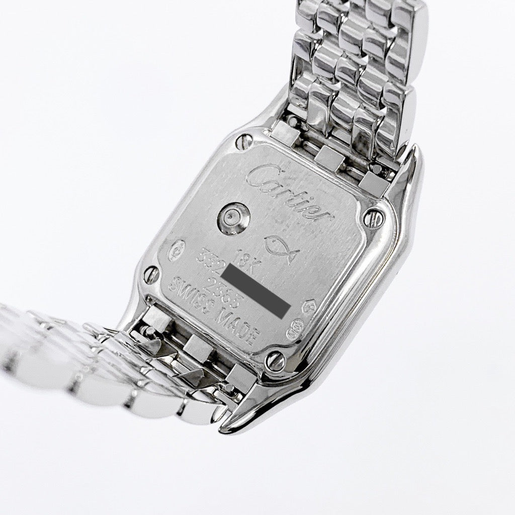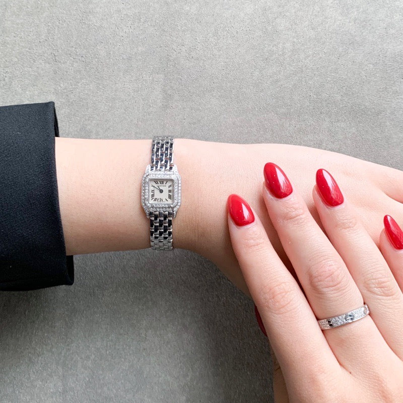 1983年に誕生して以降、不動の人気を誇る《パンテール ドゥ カルティエ》 まるでジュエリーのような着け心地のミニサイズ。 K18素材でベゼル全体に施された純正のダイヤモンドが贅沢で気品に満ちた腕元を演出。 2025年8月にカルティエコンプリート済みで安心してご愛用いただけます。