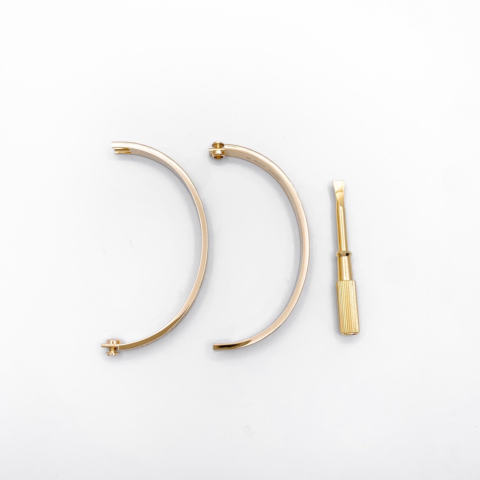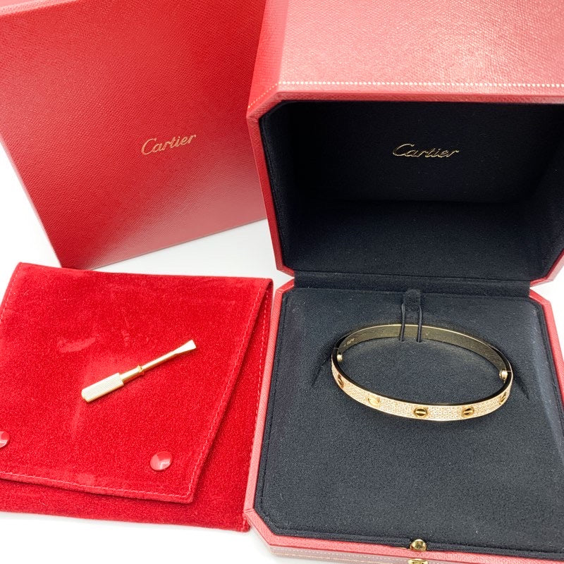 1969年にデビューしたカルティエの代表的なブレスレット《ラブブレス》 モチーフであるビスを惹き立てながら全面に並ぶダイヤモンドが、オケージョンからカジュアルスタイルまで、シーンを選ばず腕元を華やかに演出。 脱着がスムーズな新型タイプで、ペアアクセサリーとしても人気のアイテム。外装仕上げ済みで安心してご愛用いただけます。