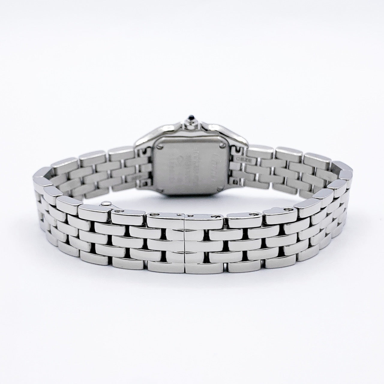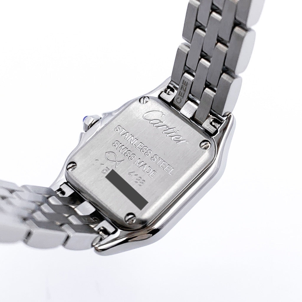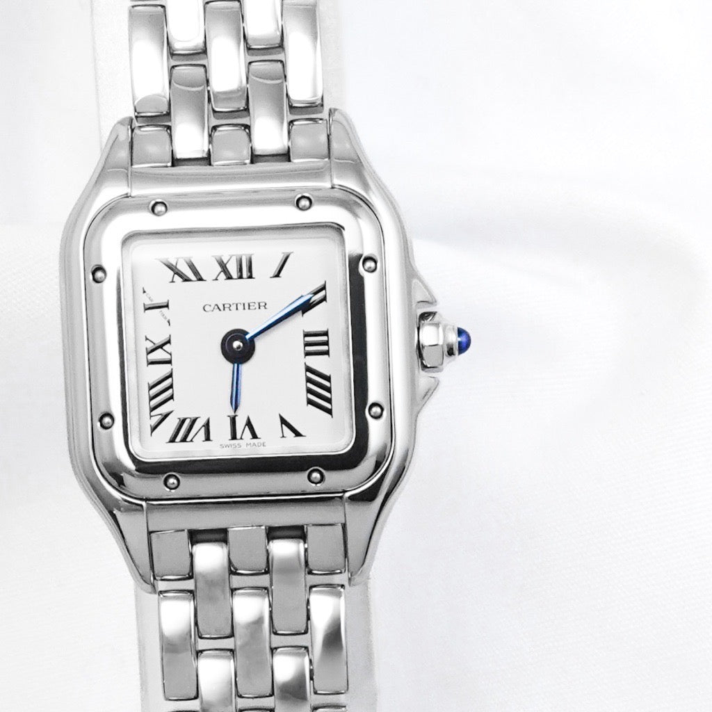カルティエを象徴する名作「パンテール」の中でも、ひときわ繊細な存在感を放つミニサイズ。 ステンレススティールのクリーンな輝きと、ジュエリーのようにしなやかなブレスレットが、腕元に上品な華やぎを添えます。 ミニサイズならではの控えめなボリューム感は、華奢な手元をより美しく演出。 アクセサリー感覚で身に着けられ、フォーマルからカジュアルまで幅広いスタイルに自然に溶け込みます。 カルティエらしいエレガンスを、日常にさりげなく取り入れたい方におすすめの一本。 時計でありながら、ジュエリーとしても完成されたタイムピースです。 さらに、2021年7月のカルティエ国際保証書付き&当店職人、一級時計修理技能士による電池交換、点検、外装仕上済みで安心してご愛用いただけます。