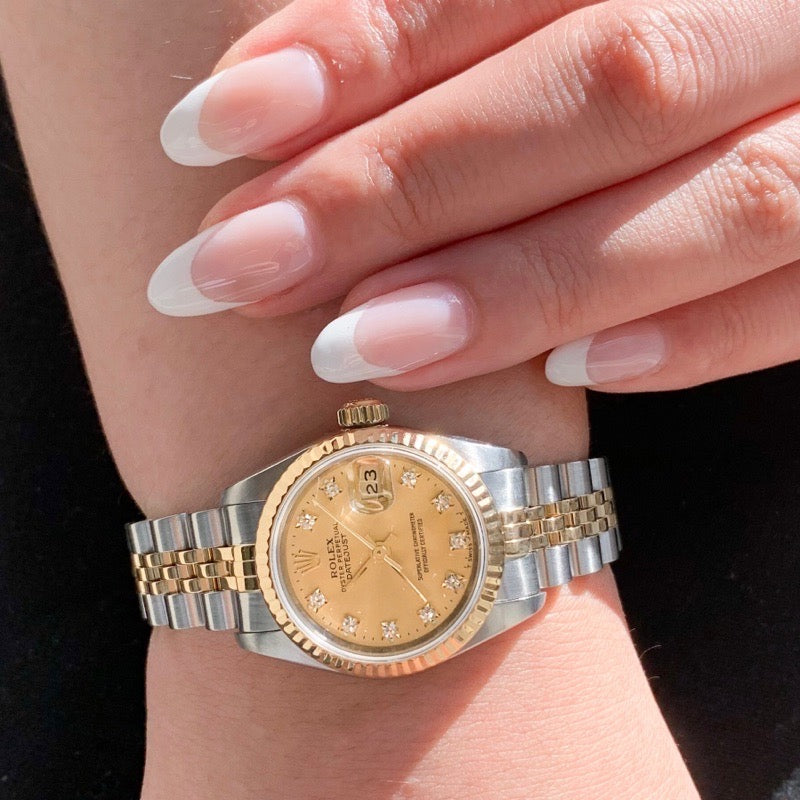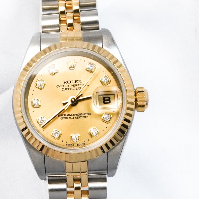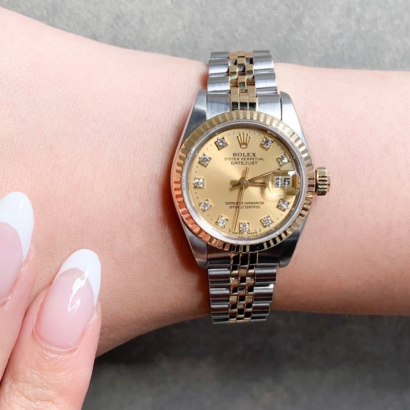 クラシックで女性らしいモデルのデイトジャスト10Pダイヤモンド。 厳しい品質基準を満たしたダイヤモンドが使用されたロレックスこだわりのコレクション。 知的さと可憐さを演出し、ファーストロレックスとしても人気なアイテム。 シャンパンカラーの文字盤が上品な輝きを放つ。 一級時計修理技能士による点検、外装仕上済みで安心してご愛用いただけます。