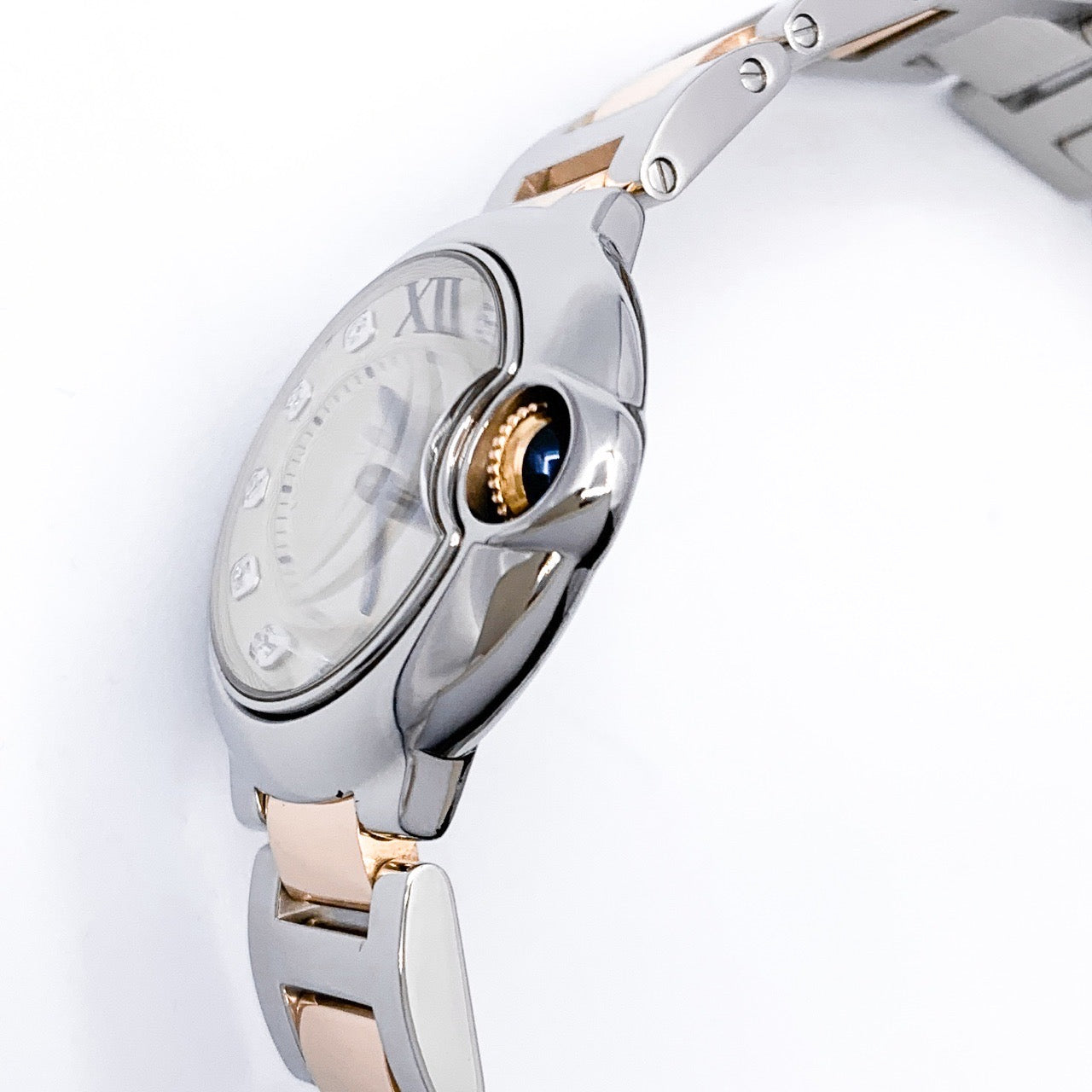 バロンブルーならではの滑らかなケースラインと、守られるようにデザインされたリューズが、カルティエらしい洗練を感じさせる一本。