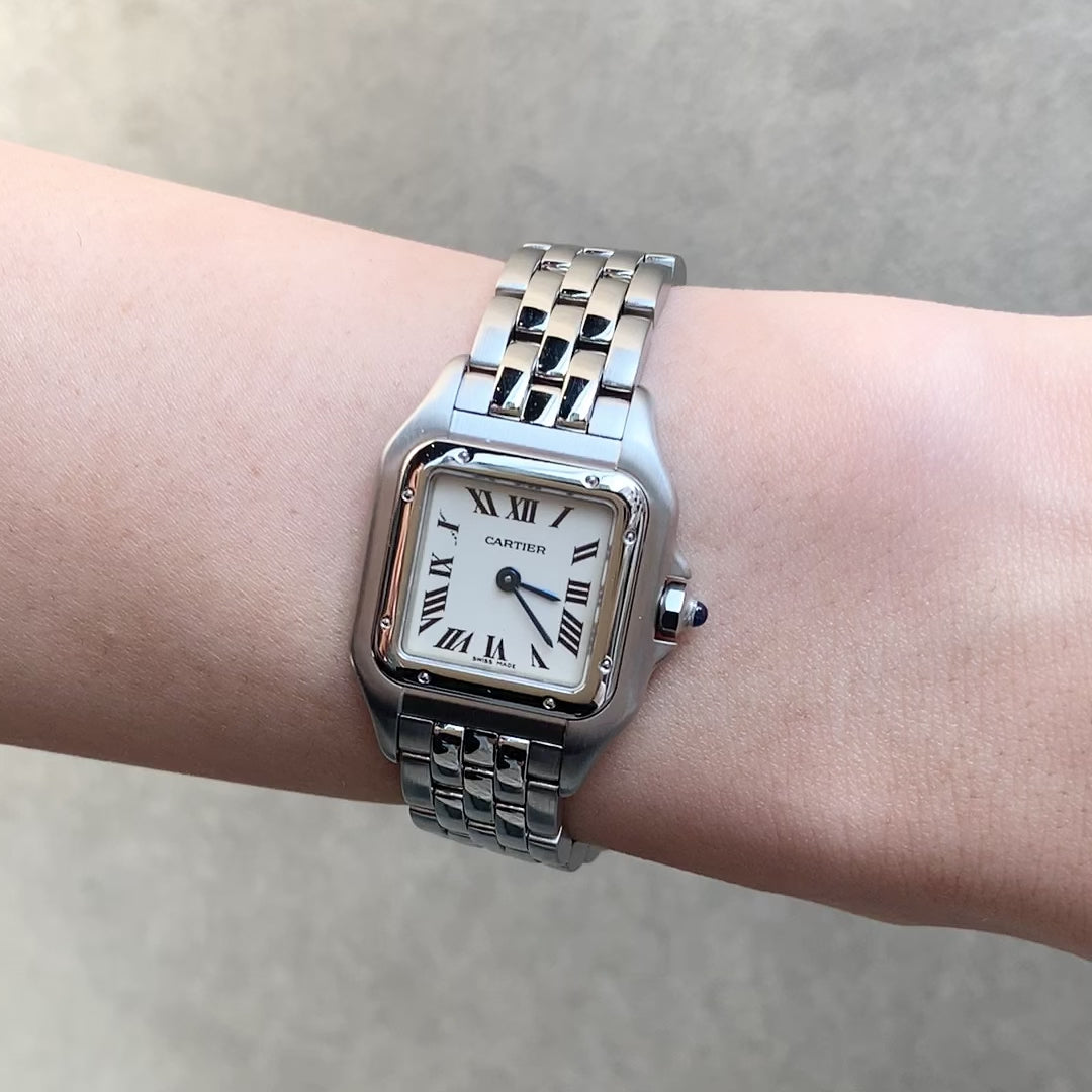 尺寸:表壳宽度约 22 毫米,表带最长约 15.6 厘米。表带:卡地亚原装表带(如需加装延长链节,请在购买前联系我们)。