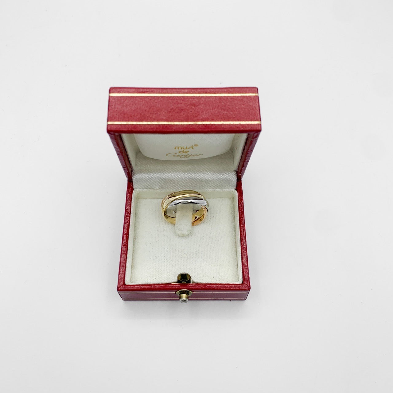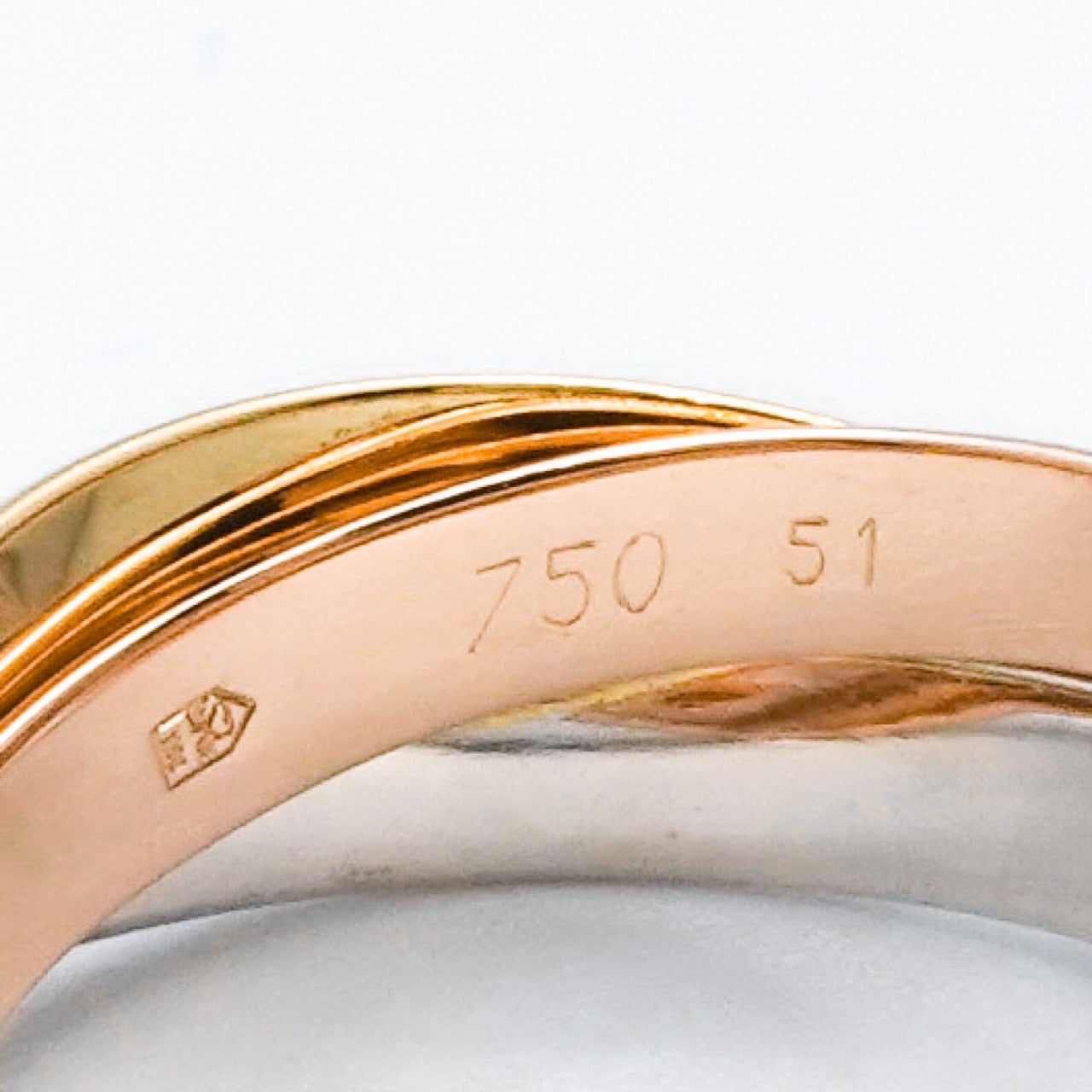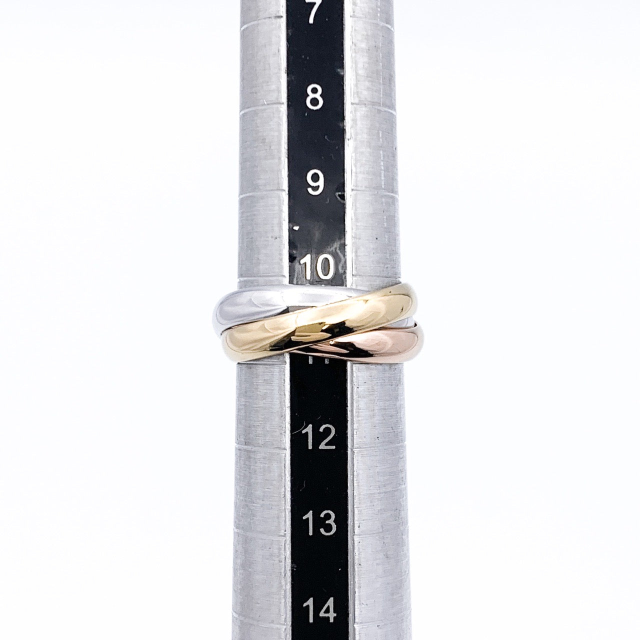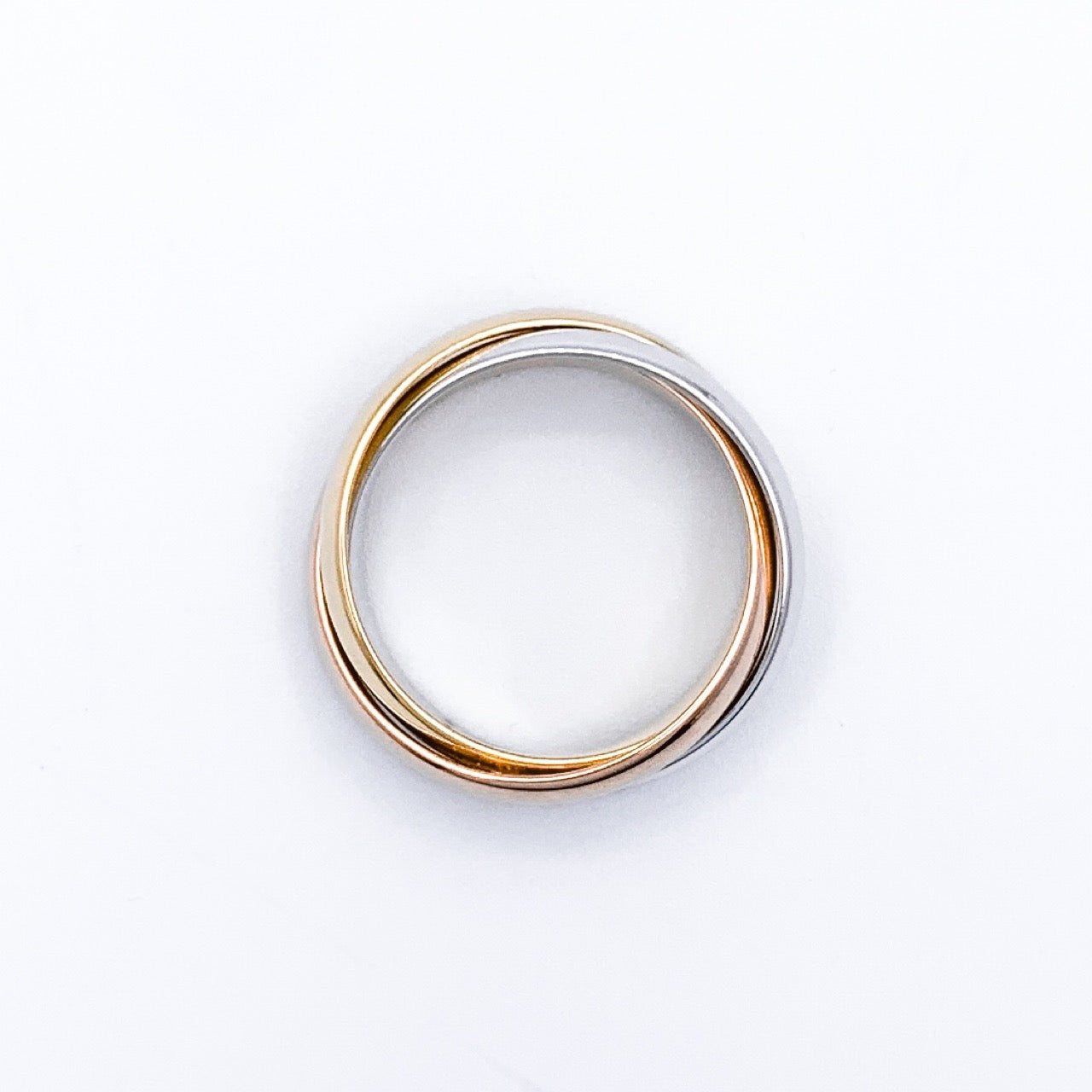 永遠のバランスを纏う、「トリニティリング」 3つのゴールドが柔らかく重なり合うトリニティリングは、カルティエを象徴するタイムレスな名作。 イエロー・ホワイト・ピンク、それぞれの色味が調和しながらも個性を放ち、手元に奥行きのある美しさを添えてくれます。 指を動かすたび、リング同士がふわりと触れ合い、まるで“自分らしさ”が揺らぎなく重なっていくような感覚。 シンプルでありながら、他にはない存在感を生み出すデザインは、年齢やスタイルを問わず馴染むのも魅力です。 さらに、外装仕上げ済みで安心してご愛用いただけます。