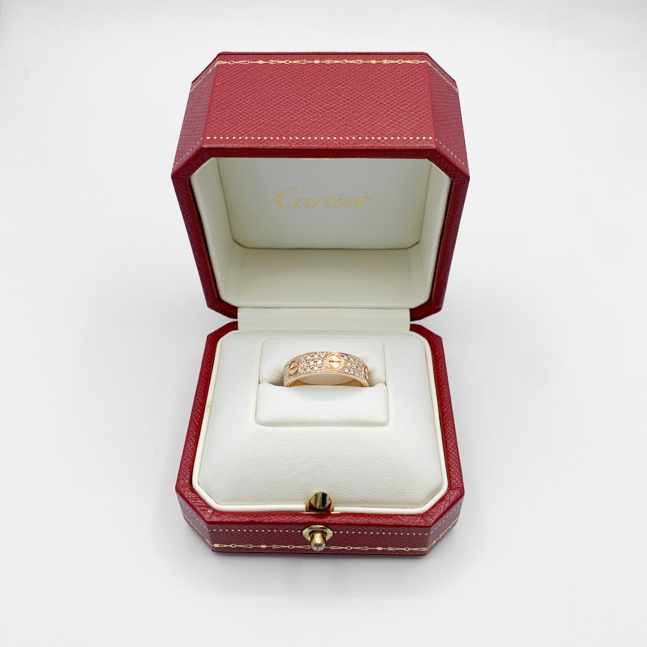 時を経ても褪せることのない普遍的なデザインで、カルティエジュエリーのなかでも不動の人気を誇る《ラブリング》 ペアアクセサリーとしても愛される名品。 モチーフであるビスを惹き立てるように、周りをダイヤモンドで埋め尽くしたフルパヴェダイヤ仕様。 ファッションリングとしても優秀で、印象に残る理想のスタイルへ。外装仕上げ済みで安心してご愛用いただけます。