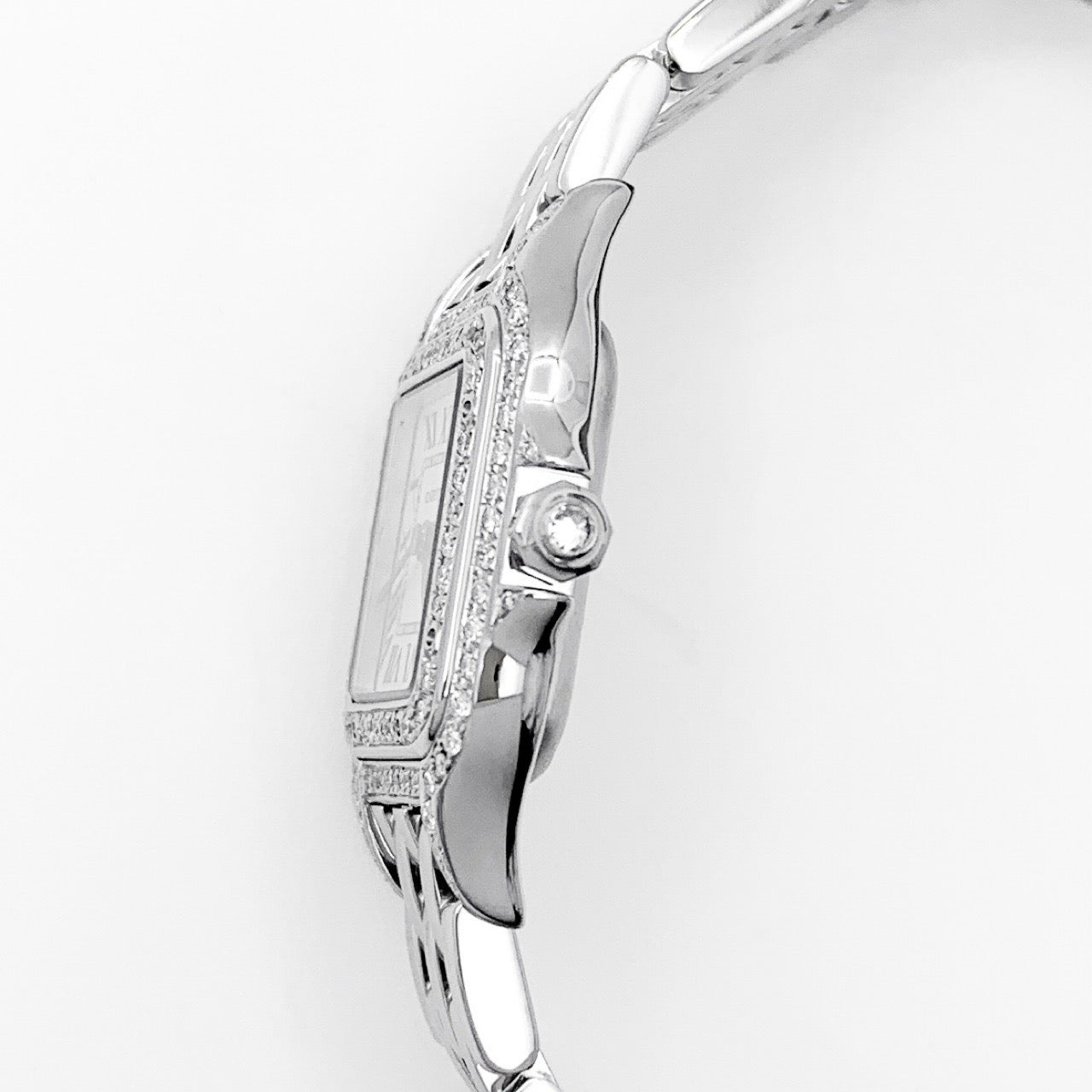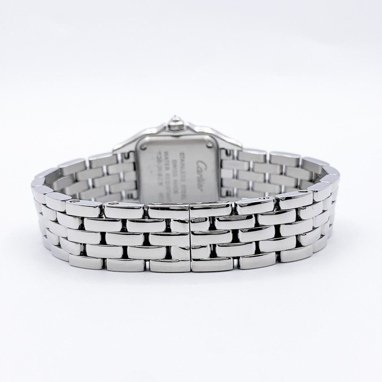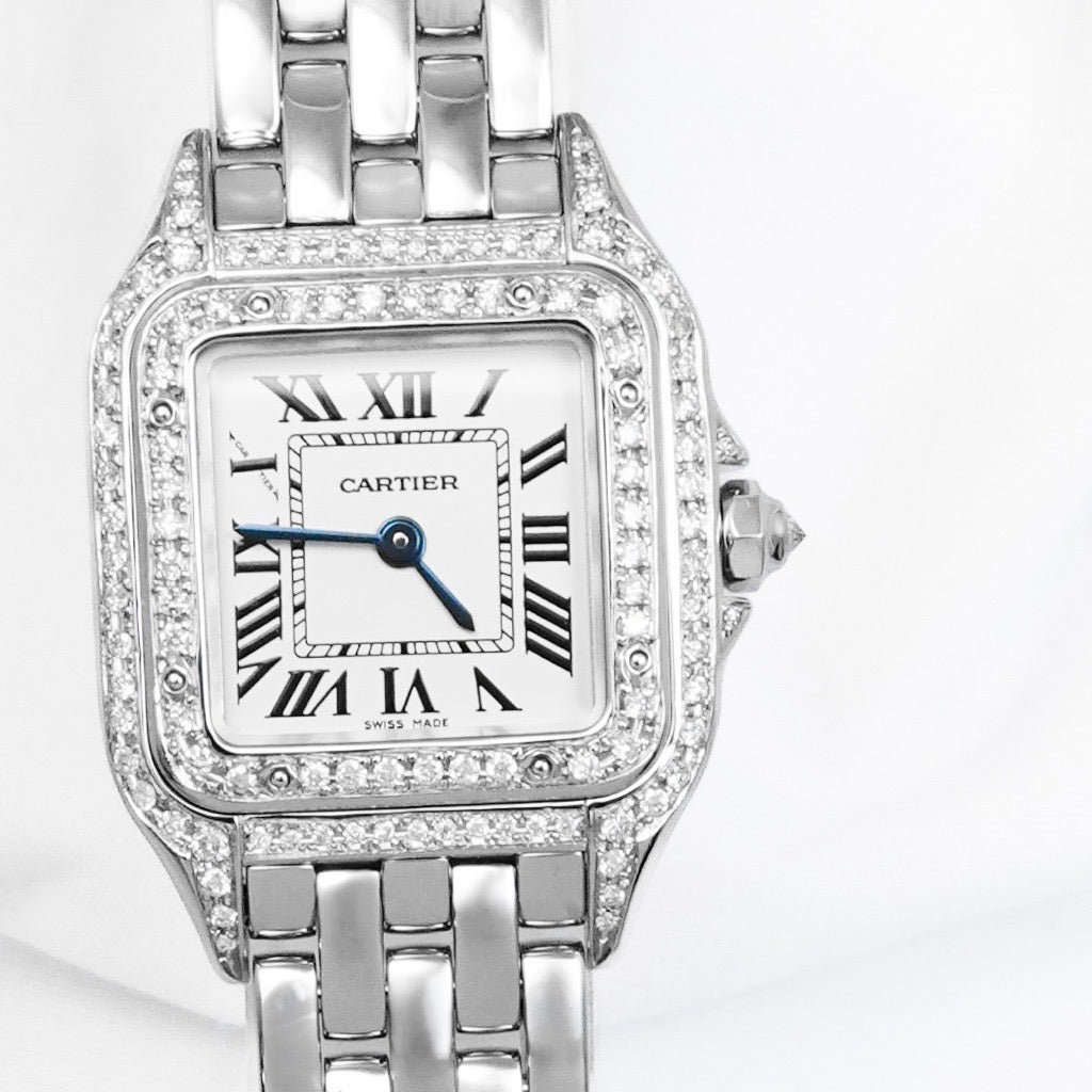 1983年に誕生して以降、不動の人気を誇る《パンテール ドゥ カルティエ》 一度は廃盤になりながら、待望され復刻した現行モデル。 ベゼルに贅沢に施されたダイヤモンドと、繊細なブレスデザインが気品のある腕元を演出。 オケージョンからカジュアルスタイルまで幅広く合わせやすく、日常のスタイルに彩りを与える。 当店職人、一級時計修理技能士による電池交換、点検、外装仕上済みで安心してご愛用いただけます。