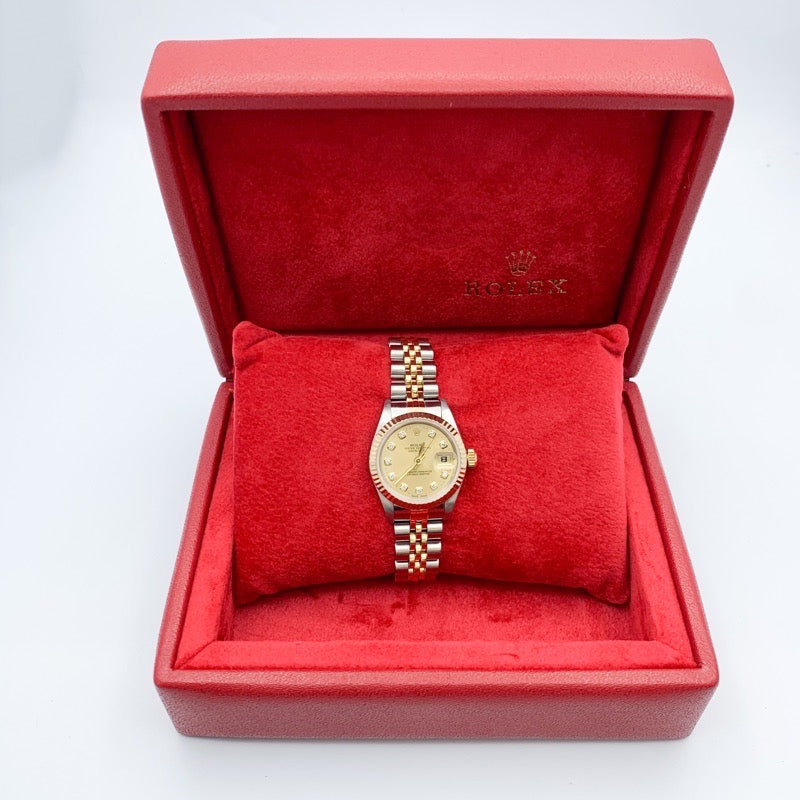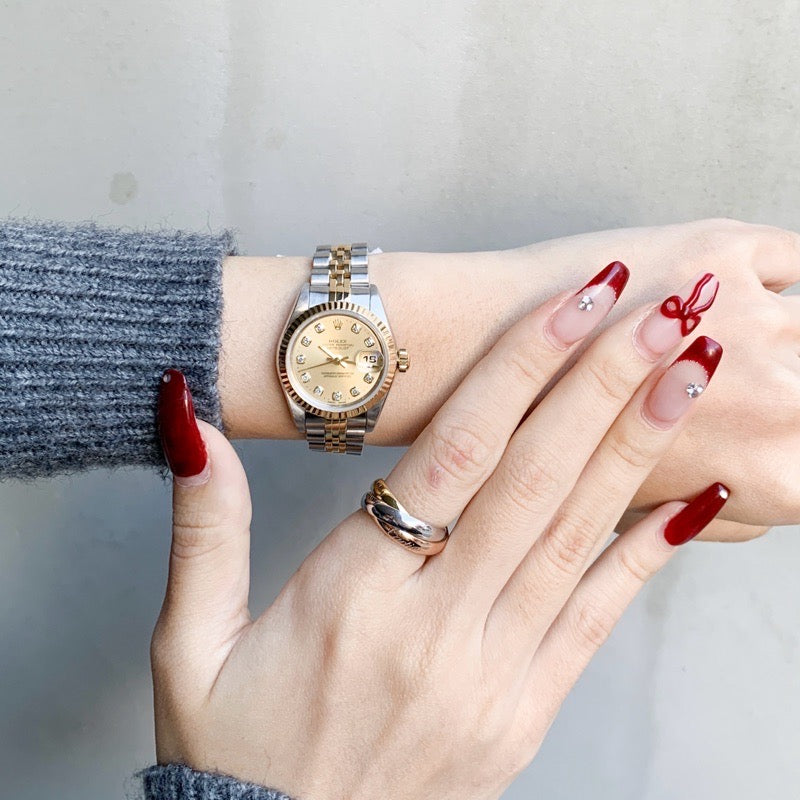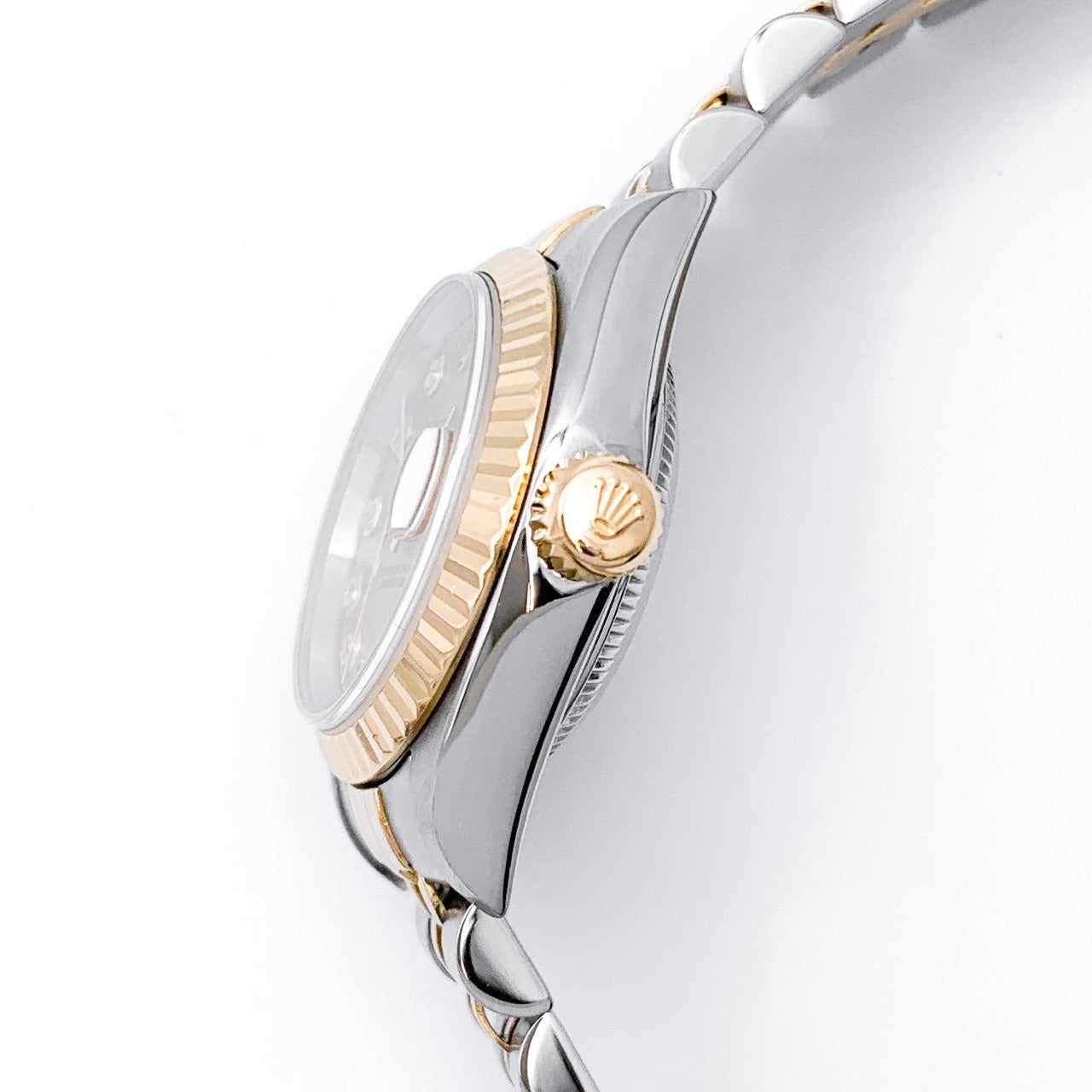 クラシックで女性らしいモデルのデイトジャスト10Pダイヤモンド。 厳しい品質基準を満たしたダイヤモンドが使用されたロレックスこだわりのコレクション。 知的さと可憐さを演出し、ファーストロレックスとしても人気なアイテム。 シャンパンカラーの文字盤が上品な輝きを放つ。 一級時計修理技能士による点検、外装仕上済みで安心してご愛用いただけます。