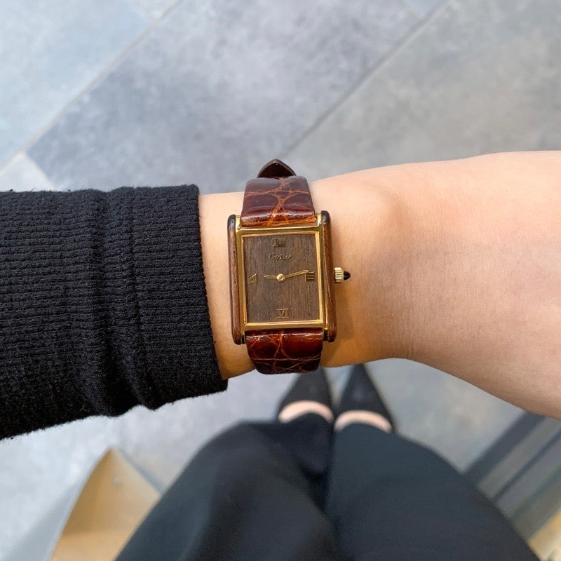 ウッドの質感。その木目。その色の深み。 “Organic Tank”はタンクの品の良さに、自然素材のぬくもりを足したようなモデル。 金属の冷たさがなくて、肌にすっと馴染む感じ。 しかも、木目はひとつひとつ違うから、世界に同じものは存在しない。 ファッション目線でも優秀で、ベージュ・カーキ・ブラウン系の洋服やレザー小物と合わせると一気に洒落見え。 世界に約3000本しか存在しないとされており希少性も高く「タンクは欲しい、でも既視感は嫌」そんな人におすすめの一本。 カルティエ正規メンテナンスによるコンプリートサービスに加え、文字盤の修復やガラス交換済みの機能性も安心の逸品です。特に着目したいのが、尾錠も当時のカルティエオリジナルの純正尾錠。そして、木製の時計本体や裏蓋をみてわかる最高級コンディション。 世界で流通する事が珍しい1本。かつ、このコンディションの個体はもう2度と流通しない1本と言える希少個体です。是非、大阪堀江店にて手に取ってご覧くださいませ。